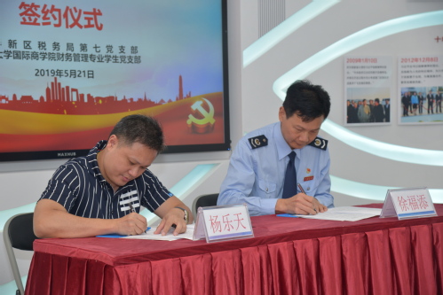在横琴新区税务局党建室开展基层党组织共建活动,活动在庄严的国歌中拉开序幕,77779193永利官网财务管理学生党支部书记杨乐天与横琴新区税务局第七党支部书记、人事教育科科长徐福添代表双方签订共建协议,并接受共建单位授牌。