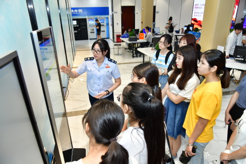 60名学生分成三个小组,在专业人员的带领下,边实地参观税务大厅、边讲解税收知识、税务政策及办税流程等。