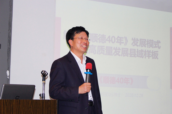 签约仪式后,广东顺德农商银行总行办公室副主任兼总行研究所副所长欧阳以标为全院教师开展“解码《顺德40年》发展模式,建设高质量发展县域样板”的主题讲座。他在开场中介绍《顺德40年:一个中国改革开放的县域发展样板》一书,在书中能全面了解顺德模式、顺德改革,并以广东体制改革先行者的视角,深入剖析顺德改革发展历程,风趣介绍顺德饮食与审美文化以及美的、碧桂园等顺德知名企业。他表示顺德作为一个县级区域在改革发展洪流中取得成功,离不开中国特色社会主义政治制度优越性以及基层人民的勤奋努力,在未来发展中,顺德应抢抓粤港澳大湾区机遇,开拓出一条高质量发展之路。