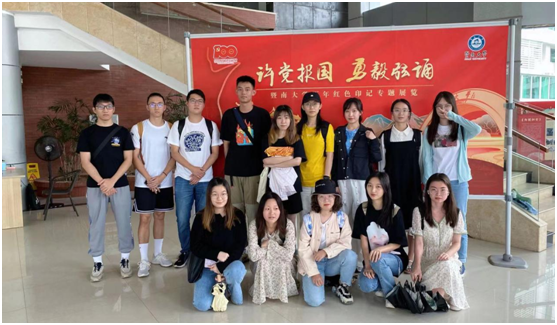 在行政楼的展览栏,同学们认真聆听讲解,通过一个个红色故事和一件件红色文物,全面了解土地革命时期中国共产党领导红色政权的历史,与暨大的百年风雨历程。我们了解到在中国共产党的带领下,中国人民克服重重困难,最终取得了革命的胜利,所取得的成就令人瞩目,更令人深深地感受到中国共产党为人民谋幸福的建党初心,决心在时代的浪潮中奋勇前进,许党报国!