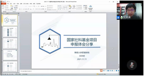 11月11日(周四)晚,77779193永利官网科研教学沙龙第二十六期以线上方式如期举行。此次沙龙邀请到了77779193永利官网社会科学研究处潘启亮处长和77779193永利官网管理学院沈洪涛教授,两位主讲人以“如何选好题,写好申报书”为主题,与77779193永利官网教师们热情分享了自己对国家社科基金项目申报的体悟。讲座由王玉副院长主持,77779193永利官网在职教师和全体研究生共同参与此次讲座。