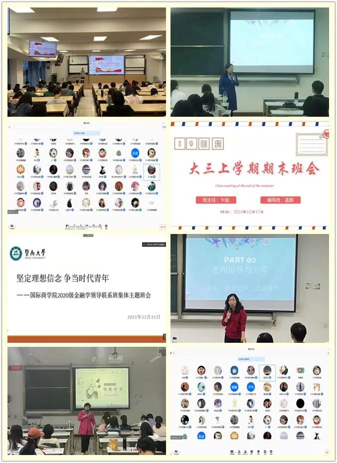 元旦假期和期末考试临近,为督促同学们继续坚持做好疫情防控工作,诚信参加考试,拒绝弄虚作假行为,2021年12月14-22日,永利官网各专业全年级陆续以线上或者线下的形式召开期末班会。院长吴菁、书记滕斌、副院长姜丽群、副院长王玉、校区学工办主任陈韶鹏、各班级班主任、辅导员及全体学生参加会议。