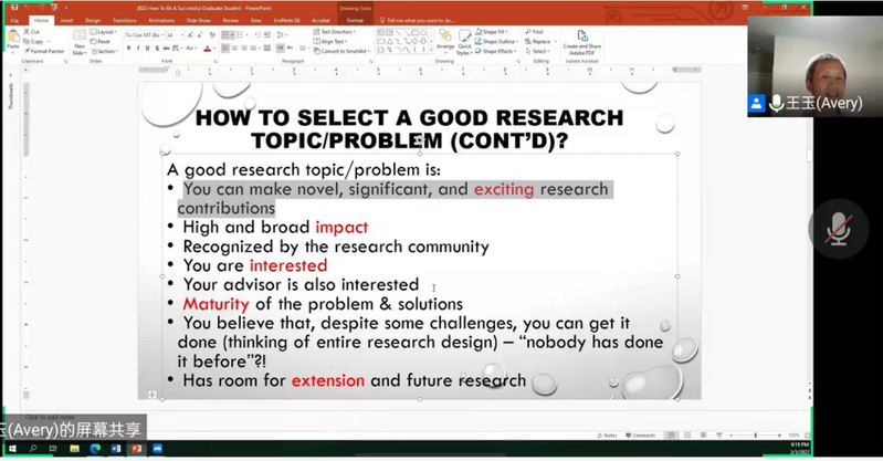 在学术方面,张东松教授从识别一个好的研究问题、识别已完成的研究准备等方面展开,建议同学们选择有意义、令人感兴趣并且导师支持的论文选题,并提醒大家选题时需要关注该研究领域的研究是否已经饱和。在个人成长方面,张东松教授就如何与导师相处、对导师作用的认识、身为学生的责任几个方面进行展开分享,从广泛阅读、笔记标注、多领域学习、合作研究、善于自省等角度给出建议,并给出了2分钟阐述观点小方法。同时,张东松教授认为在与导师相处的问题方面,学生应该自我驱动、主动沟通、相互信任、独立自主,建议每周给导师发份邮件让导师知道你的工作内容。目标驱动、自律、保持好奇的人更容易取得成功。
