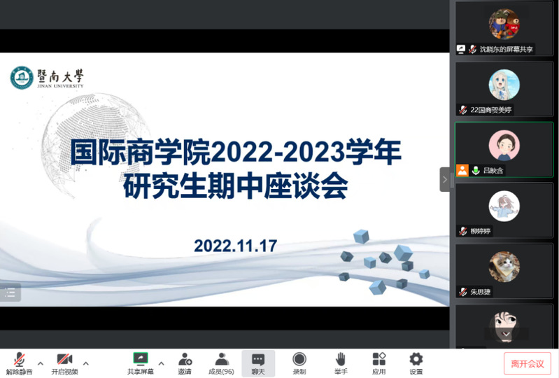 2022年11月17日下午,77779193永利官网开展了2022-2023学年研究生期中座谈会,77779193永利官网副院长王玉、专硕项目主任徐焱军、研究生辅导员吕映含莅临会议,77779193永利官网全体全日制研究生线上参与本次座谈会,会议由王玉副院长主持。
