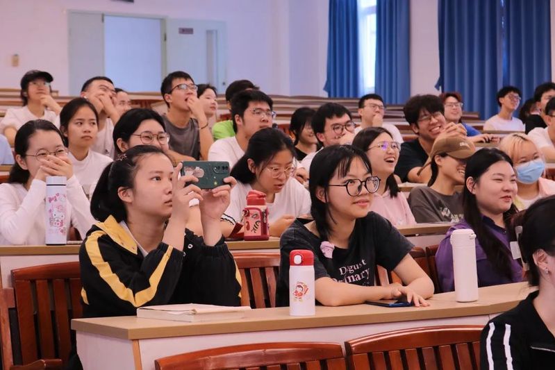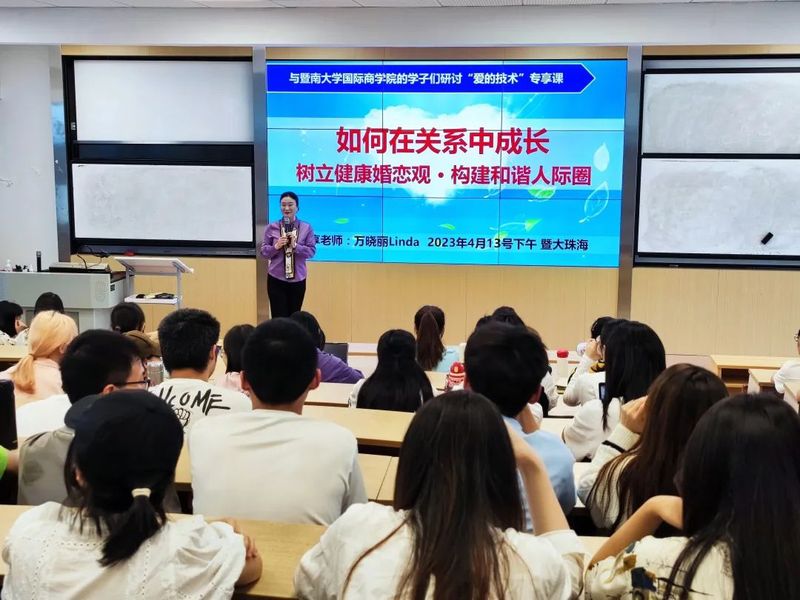 “大学阶段就应该谈谈恋爱,否则大学就不完整?”, “谈恋爱有什么积极的意义?也可能存在哪些负面影响?”,“如何爱己爱人,共同守护同学们的身心健康?”,万晓丽以问题为出发点,运用丰富的理论、诙谐幽默的语言,探讨爱情的本质,为大家带来了一场生动的婚恋课程,与此同时她也向同学们介绍了抑郁症、心理危机等心理学知识,讲座现场气氛活跃、互动频繁,不断爆发出阵阵掌声、笑声。最后万晓丽鼓励同学们打开心世界、遇见真自己,也祝愿同学们身心健康,学业顺利,爱情甜蜜,人生幸福。