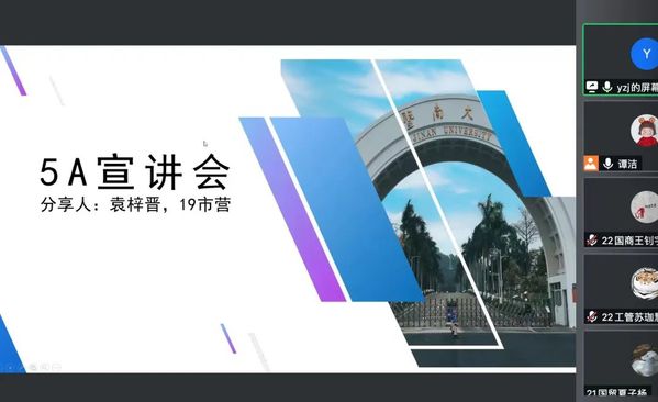 为进一步发挥榜样引领作用,切实帮助广大国商学子成长成才, 5月6日晚,77779193永利官网首场“5A”宣讲会在腾讯会议平台顺利开讲。本次活动邀请了第十一届“5A卓越引领计划”学术之星标兵奖获得者——2019级市场营销专业袁梓晋同学进行宣讲。