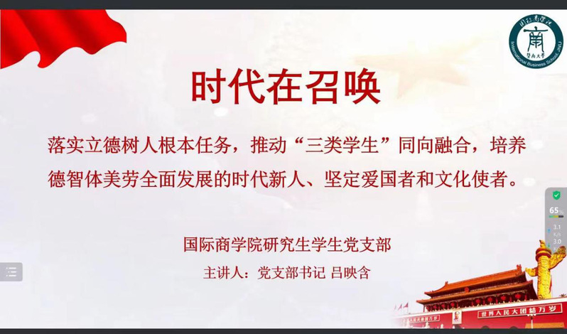 研究生学生党支部书记吕映含强调学校一直以来认真贯彻全国教育大会精神,落实立德树人根本任务,推动“三类学生”同向融合,培养德智体美劳全面发展的时代新人、坚定爱国者和文化使者。